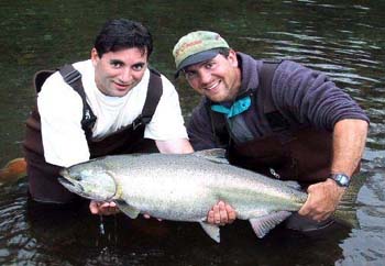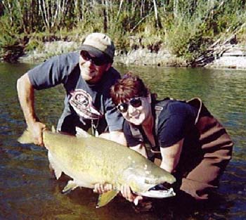 Albertian Ruth with her Huge Fly Caught Salmon, it takes two to Lift! (Chinook, King)